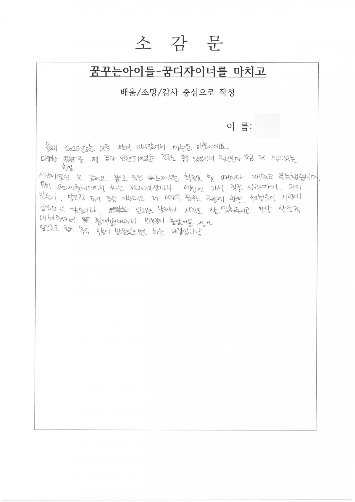 꿈꾸는아이들 꿈디자이너 꿈발표회(사업평가회) 및 바베큐요리 페이지 정보 작성자최고관리자 댓글 0건 조회 22회 작성일 25-12-09 21:01 본문 일시: 2025. 11.29(토)/장소: 포시즌가든/내용: 꿈디자이너 꿈발표회(사업평가회) 및 바베큐요리 목록 답변 이전글꿈꾸는아이들 꿈디자이너 보호자 활동(가죽공예) 25.12.09 다음글2025 특성화사업 최종평가회 25.12.09 댓글목록 댓글목록 등록된 댓글이 없습니다.